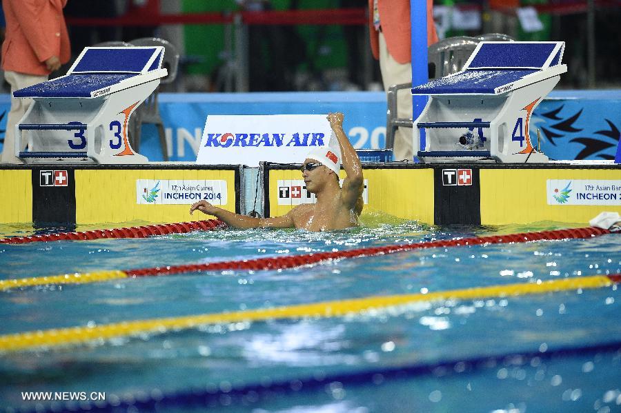 | Shi Yang of China celebrates after winning the men's 50m butterfly final of swimming event at the 17th Asian Games in Incheon, South Korea, Sept. 25, 2014. Shi Yang won the gold medal with 23.46 seconds. (Xinhua/Wang Peng) |