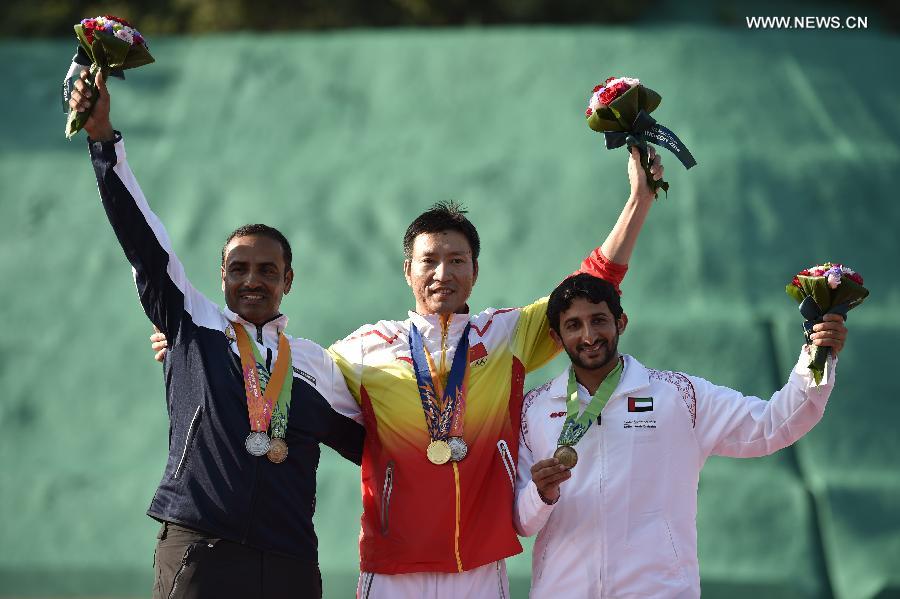 Gold medalist Hu Binyuan of China (C), silver medalist Aldeehani Fehaid of Kuwait (L) and bronze medalist Almaktoum Juma of United Arab Emirates pose during the awarding ceremony of the double trap men's competition of shooting event at the 17th Asian Games in Incheon, South Korea, Sept. 25, 2014. (Xinhua/Lui Siu Wai)