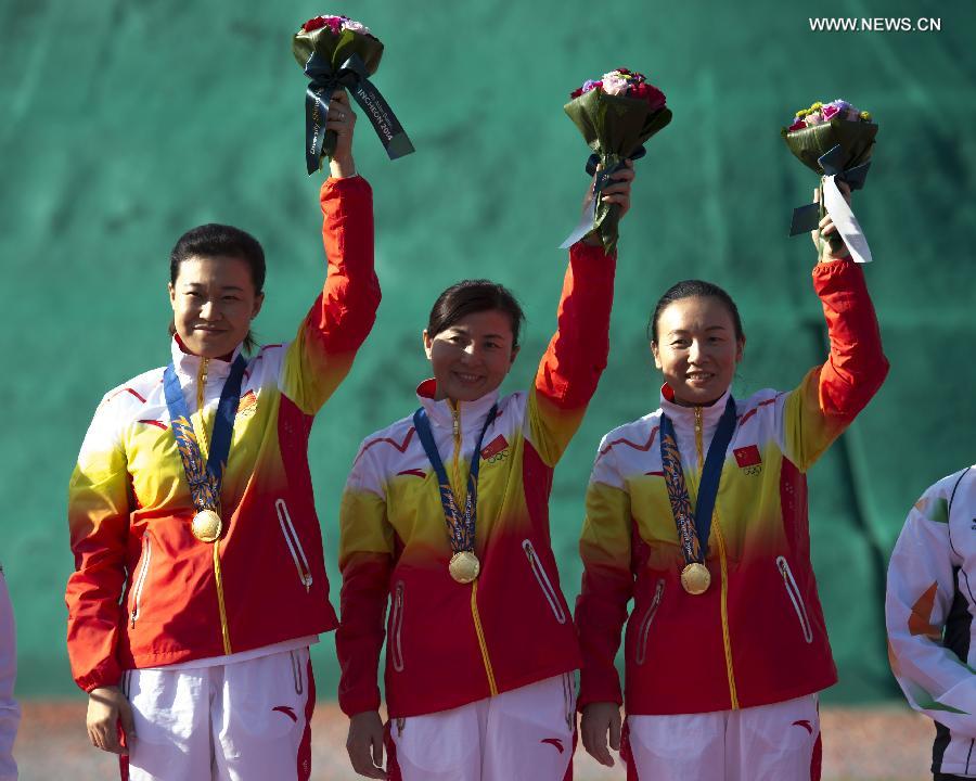 Bai Yiting, Zhang Yafei and Zhu Mei (L to R) of China pose during the awarding ceremony of the double trap women's team of shooting competition at the 17th Asian Games in Incheon, South Korea, Sept. 25, 2014. China won the gold medal. (Xinhua/Lui Siu Wai)
