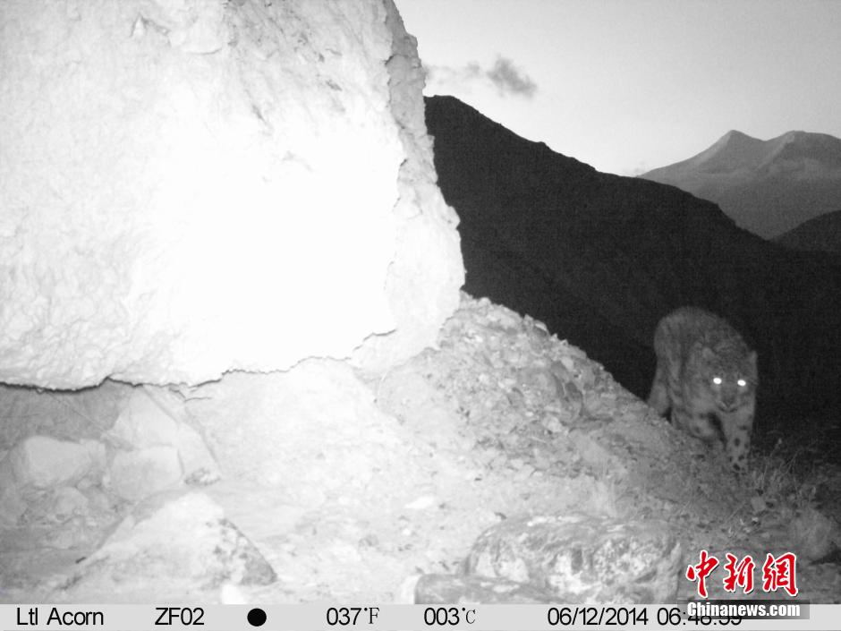 Snow leopard is taken pictures by camara for the first time in field in natural reserve area of Tibet's Mount Qomolangma, Sept. 24, 2014. (Photo source:chinanews.com)