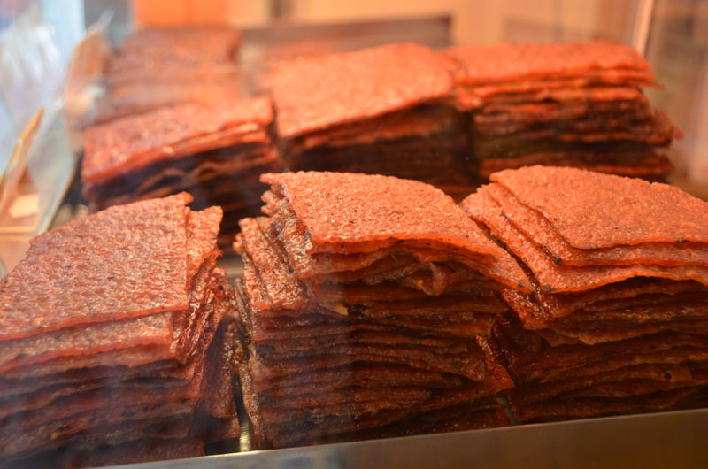 Jerky is sold at a centuries-old shop on South Bridge Road of the Chinatown. (People's Daily Online/Du Mingming)