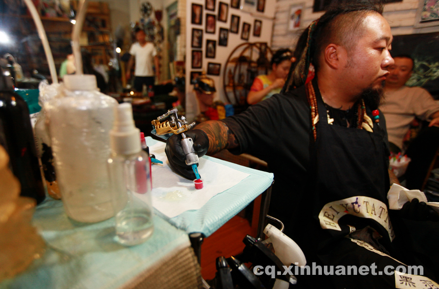 On July 21st, Pan is preparing tattoo implements. (Xinhua News Agency/Peng Bo)