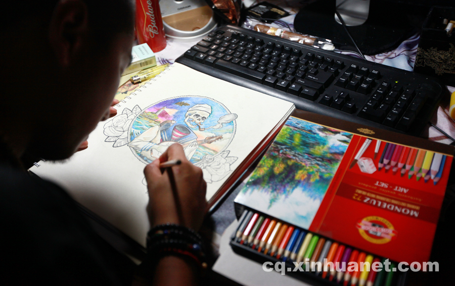Pan's assistant creates his tattoo works on July 21, 2014. Pan greatly values tattooists painting skills. "I think it is a super important part of tattooing," Pan said," because a tattoo will company with a person for his whole life." (Xinhua News Agency/Peng Bo)