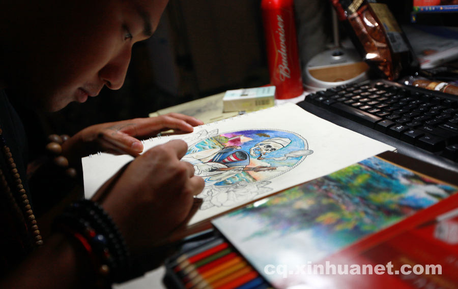 Pan's assistant creates his tattoo works on July 21, 2014. (Xinhua News Agency/Peng Bo)