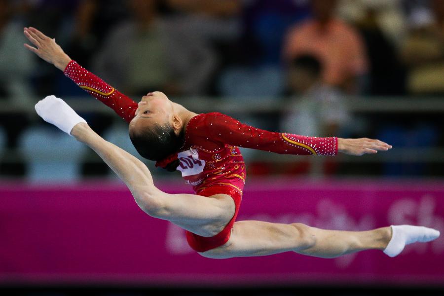 Shang Chunsong of China performs during the women's floor exercise final of gymnastics artistic event at the 17th Asian Games in Incheon, South Korea, Sept. 25, 2014. Shang Chunsong got the silver medal with 13.800 points. (Xinhua/Zheng Huansong)