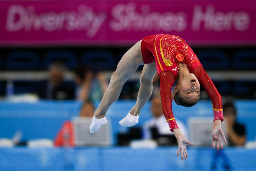 | Shang Chunsong of China performs during the women's floor exercise final of gymnastics artistic event at the 17th Asian Games in Incheon, South Korea, Sept. 25, 2014. Shang Chunsong got the silver medal with 13.800 points. (Xinhua/Zheng Huansong) |
