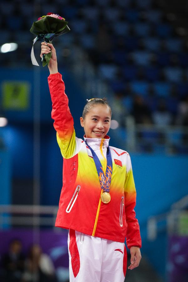 Yao Jinnan of China poses during the awarding ceremony of the women's floor exercise contest of gymnastics artistic event at the 17th Asian Games in Incheon, South Korea, Sept. 25, 2014. Yao Jinnan claimed the title with 13.966 points. (Xinhua/Zheng Huansong)