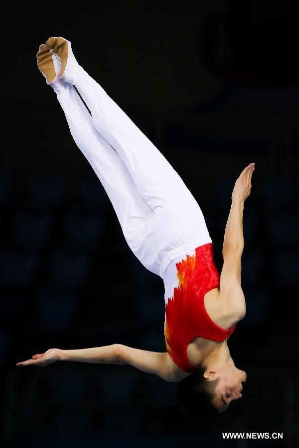 Tu Xiao of China competes during the men's final of gymnastics trampoline event at the 17th Asian Games in Incheon, South Korea, Sept. 26, 2014. Tu Xiao got the silver medal with 60.435 points. (Xinhua/Zheng Huansong)