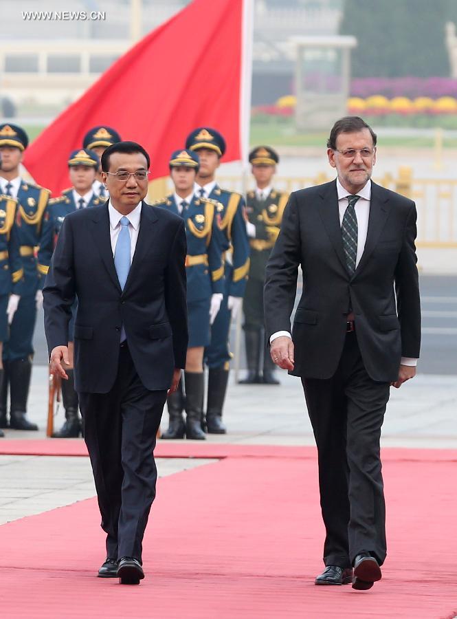 Chinese Premier Li Keqiang(L) holds a welcoming ceremony for Spanish Prime Minister Mariano Rajoy before their talks in Beijing, capital of China, Sept. 25, 2014. (Xinhua/Pang Xinglei)