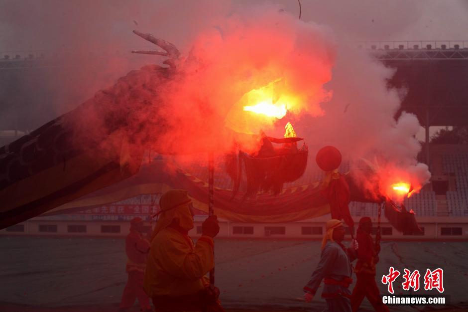 70-year-old men perform fire-dragon dance to celebrate the opening the 21st South Dstrict (Qingdao) senior games in Qingdao Tiantai stadium on Sept. 24, 2014. More than 3,000 old men between 60 and 70 years took part in the games. (Chinanews.com/Xu Chongde)