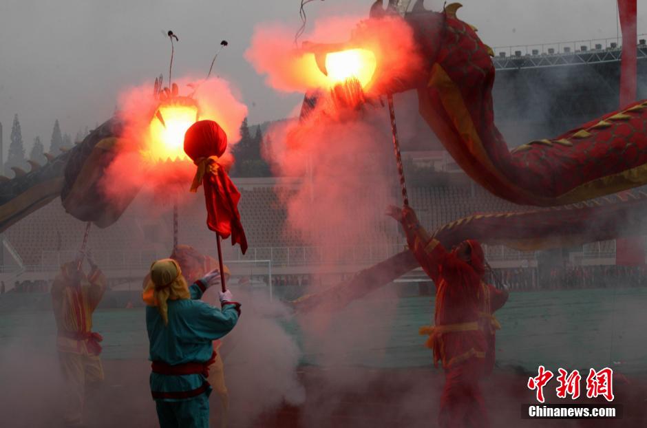 70-year-old men perform fire-dragon dance to celebrate the opening the 21st South Dstrict (Qingdao) senior games in Qingdao Tiantai stadium on Sept. 24, 2014. More than 3,000 old men between 60 and 70 years took part in the games. (Chinanews.com/Xu Chongde)