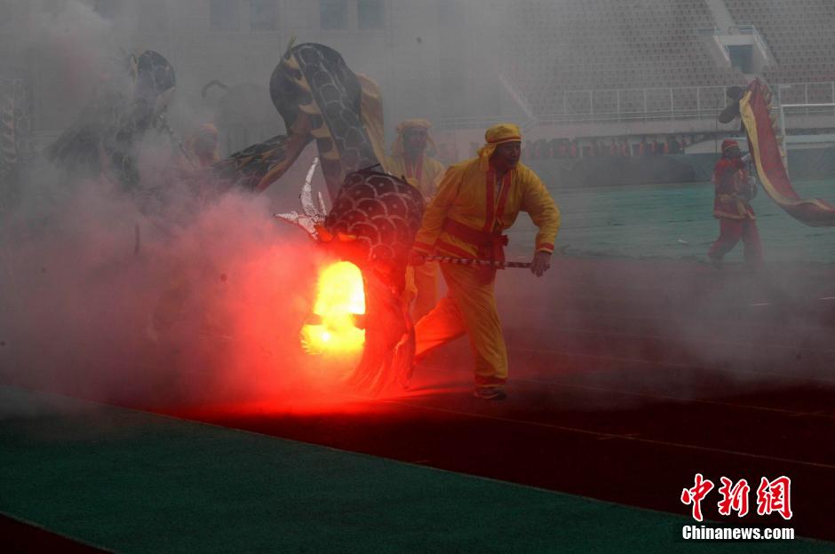 70-year-old men perform fire-dragon dance to celebrate the opening the 21st South Dstrict (Qingdao) senior games in Qingdao Tiantai stadium on Sept. 24, 2014. More than 3,000 old men between 60 and 70 years took part in the games. (Chinanews.com/Xu Chongde)
