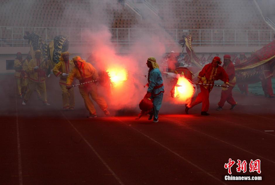70-year-old men perform fire-dragon dance to celebrate the opening the 21st South Dstrict (Qingdao) senior games in Qingdao Tiantai stadium on Sept. 24, 2014. More than 3,000 old men between 60 and 70 years took part in the games. (Chinanews.com/Xu Chongde)