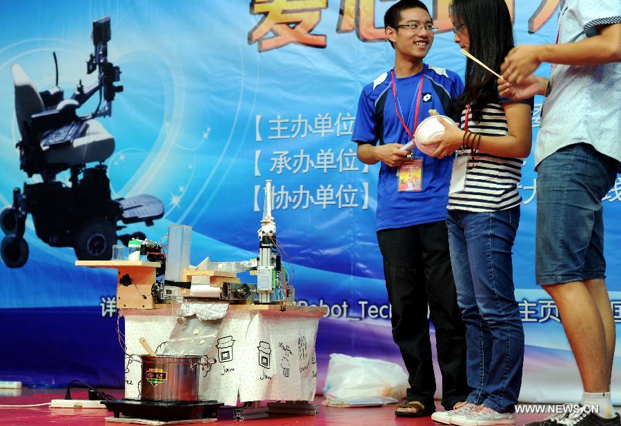 A robot uses a microwave oven to cook noodles in the 14th RoboGame Robot Competition at University of Science and Technology of China in Hefei, capital of east China's Anhui Province, Sept. 27, 2014. The robot competition, with the participation of a total of 36 teams, aims to improve the innovation capability and strengthen the hand-on practice of university students.(Xinhua/Liu Junxi)