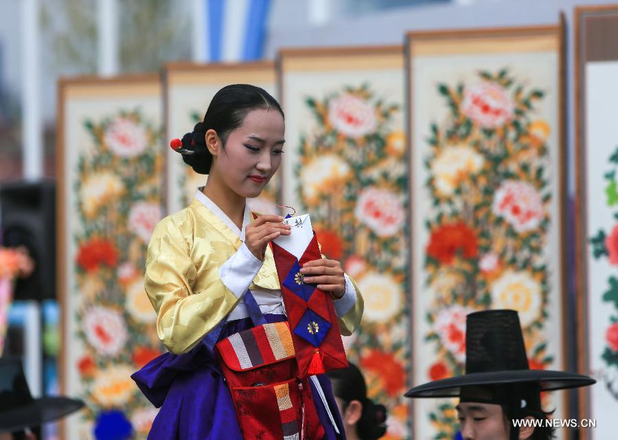 An actress shows traditional South Korean wedding procedure at the flag plaza of athletes' village of the 17th Asian Games in Incheon, South Korea, Sept. 27, 2014. A South Korean traditional wedding ceremony with a theme of "a festival event has been held" was held here on Saturday. The ceremony is for actual marriage of one of the Incheon Asian Games Organizing Committee (IAGOC). (Xinhua/Meng Chenguang)