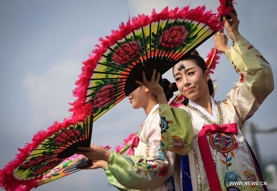 Actresses perform during a wedding ceremony at the flag plaza of athletes' village of the 17th Asian Games in Incheon, South Korea, Sept. 27, 2014. A South Korean traditional wedding ceremony with a theme of "a festival event has been held" was held here on Saturday. The ceremony is for actual marriage of one of the Incheon Asian Games Organizing Committee (IAGOC). (Xinhua/Meng Chenguang)