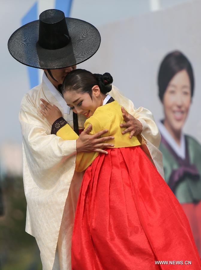 Actors perform during a wedding ceremony at the flag plaza of athletes' village of the 17th Asian Games in Incheon, South Korea, Sept. 27, 2014. A South Korean traditional wedding ceremony with a theme of "a festival event has been held" was held here on Saturday. The ceremony is for actual marriage of one of the Incheon Asian Games Organizing Committee (IAGOC). (Xinhua/Meng Chenguang)