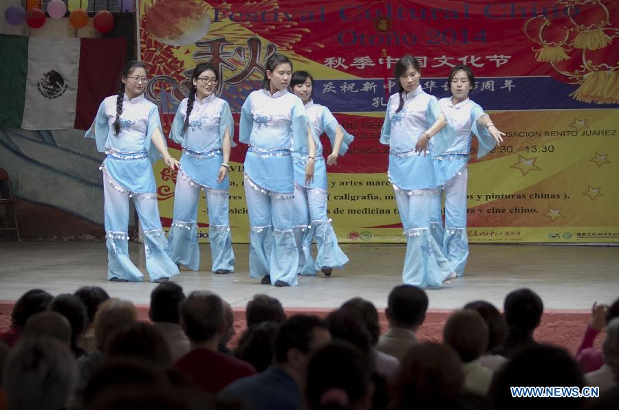 Chinese dancers perform during the 2014 Chinese Cultural Autumn Festival, in the framework of the Day of the Confucius Institute, in Mexico City, capital of Mexico, on Sept. 27, 2014. The Day of the Confucius Institute is celebrated worldwide on Sept. 27. (Xinhua/Alejandro Ayala)