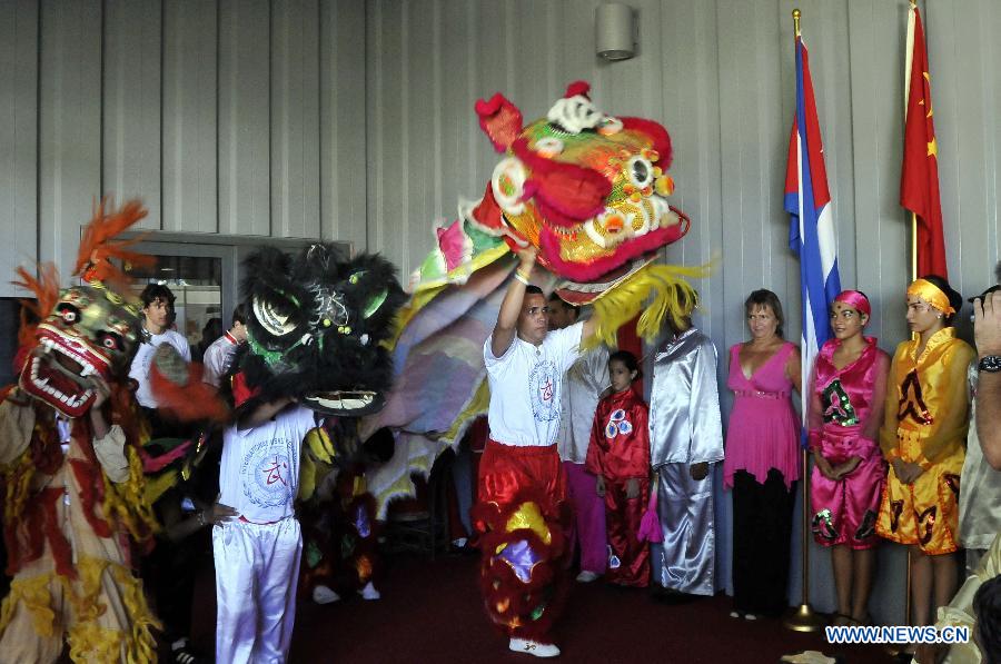 Chinese artists perform lion dance during the celebration of the Day of the Confucius Institute, at the trade fair Pabexpo, in Havana, Cuba, on Sept. 27, 2014. (Xinhua/Joaquin Hernandez)