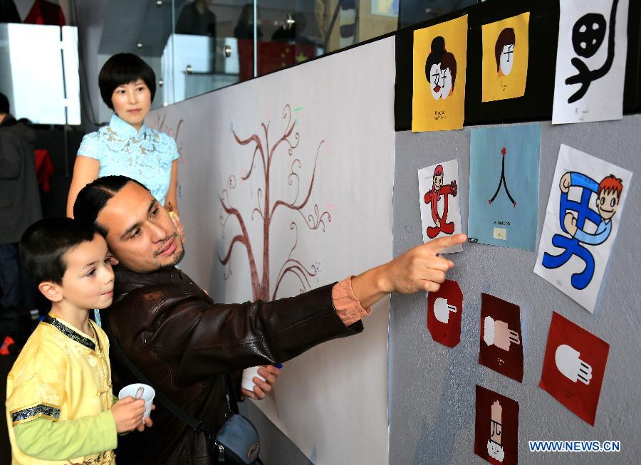 A father and his son attend an activity as a part of celebration of the Confucius Institute Day in the city hall of Reykjavik, Iceland Sept. 27, 2014. The open house activity of Chinese language and culture, held by Northern Light Confucius Institute in Iceland, attracted more than 600 local visitors.(Xinhua/Huang Xiaonan)