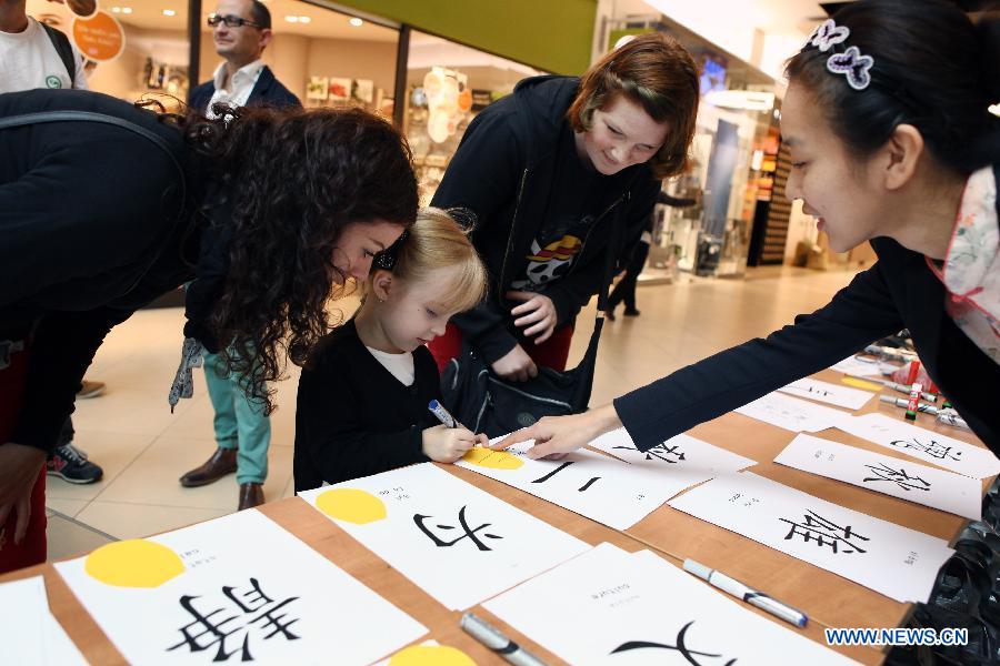 A teacher from Confucius Institute Bratislava bureau (R) teaches Slovakians Chinese calligraphy in Bratislava, Slovakia, Sept. 27, 2014. The Day of the Confucius Institute is celebrated worldwide on Sept. 27, marking the 10th anniversary of the founding of Confucius Institutes. (Xinhua/Andrej Klizan)