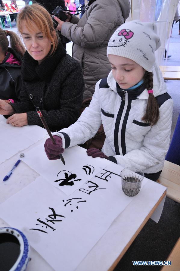 Estonian children learn to write Chinese calligraphy in Talinn, Estonia, on Sept. 27, 2014. Various Chinese cultural activities marking the first Confucius Institute Day or 10th anniversary of the institute's establishment held at campus at Tallinn University in Tallinn, captital of Estonia on Saturday. (Xinhua/Viktor Vesterinen)