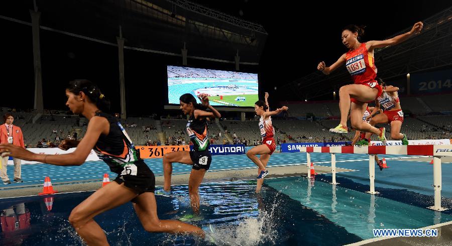 Li Zhenzhu (R) of China competes during the women's 3,000m steeplechase final match of athletics at the 17th Asian Games in Incheon, South Korea, Sept. 27, 2014. (Xinhua/Lin Yiguang)