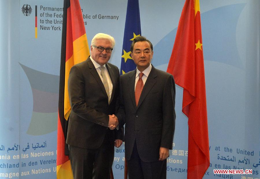 Chinese Foreign Minister Wang Yi (R) meets with German Foreign Minister Frank-Walter Steinmeier in New York, on Sept. 27, 2014. (Xinhua/Yin Bogu)