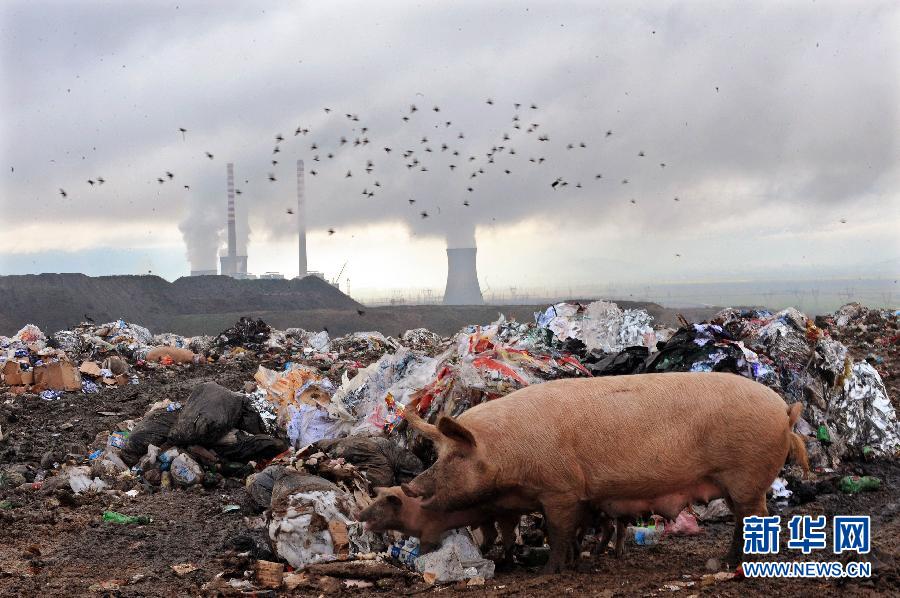 Several pigs try to find food in garbage near a coal-fired plant in Bitola, Macedonia, Dec. 15, 2009. (Photo/Xinhuanet)