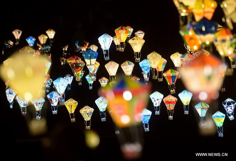 Colorful lanterns are seen at Tiehua Music Village in Taitung, southeast China's Taiwan, late Sept. 28, 2014. Artists and locals made and painted some 3,000 hot-air-balloon-shaped lanterns this summer to decorate the nearby meadow of the village, echoing the annual balloon fiesta of the city. (Xinhua/Wang Qingqin)