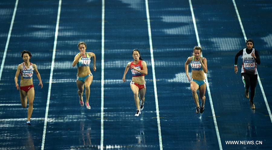 Wei Yongli (C) of China competes during the women's 100m final of athletics at the 17th Asian Games in Incheon, South Korea, Sept. 28, 2014. Wei Yongli won the gold medal with 11.48 seconds. (Xinhua/Huang Zongzhi)