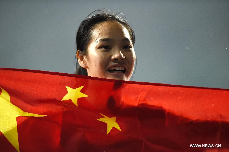| Wei Yongli of China celebrates after the women's 100m final of athletics at the 17th Asian Games in Incheon, South Korea, Sept. 28, 2014. Wei Yongli won the gold medal with 11.48 seconds. (Xinhua/Lin Yiguang) |