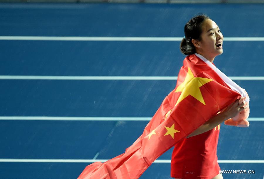 Wei Yongli of China celebrates after the women's 100m final of athletics at the 17th Asian Games in Incheon, South Korea, Sept. 28, 2014. Wei Yongli won the gold medal with 11.48 seconds. (Xinhua/Huang Zongzhi)