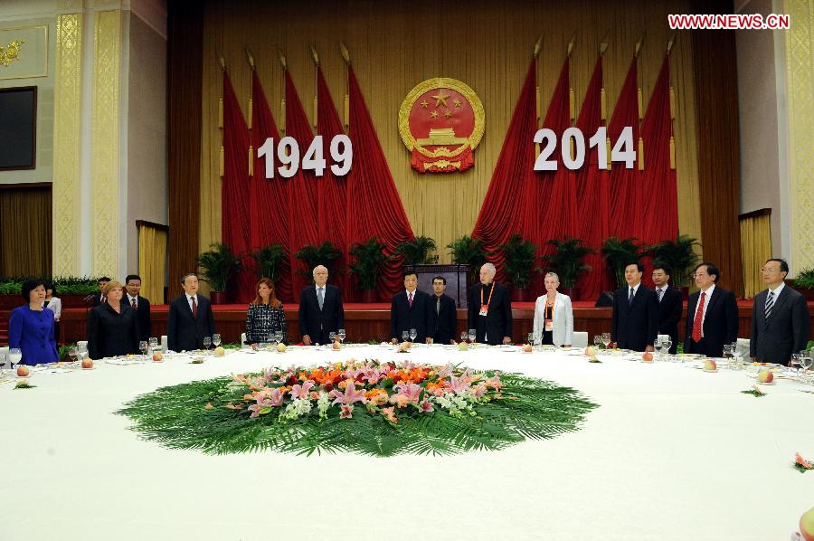 | Liu Yunshan (C), a member of the Standing Committee of the Political Bureau of the Communist Party of China (CPC) Central Committee and secretary of the Secretariat of the CPC Central Committee, attends a reception for foreign experts on the eve of the 65th anniversary of the founding of new China, at the Great Hall of the People in Beijing, capital of China, Sept. 28, 2014. (Xinhua/Rao Aimin) |