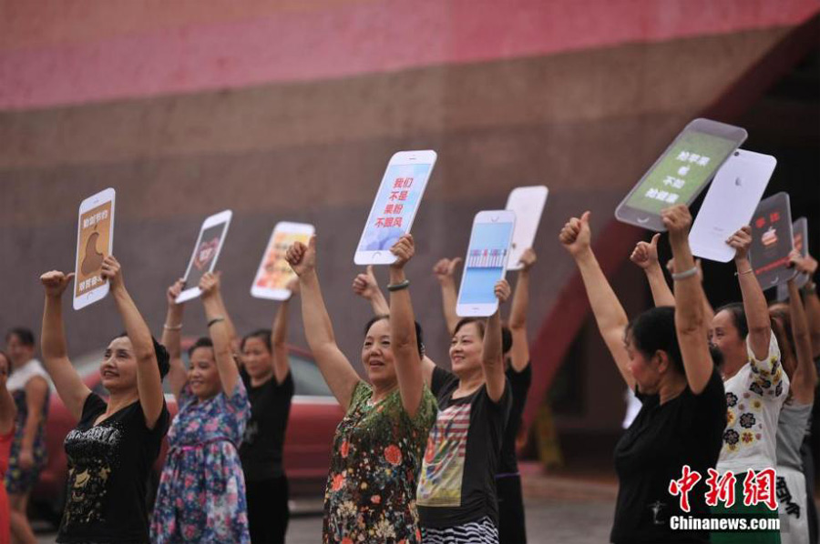 Holding paper models of iPhone6, damas dance to music "Little Apple" in the Foreigner Street in Chongqing on Sept. 26, 2014. They wanted to call for rational consumption on iPhone 6 through their dance. (CNS/Chen Chao)