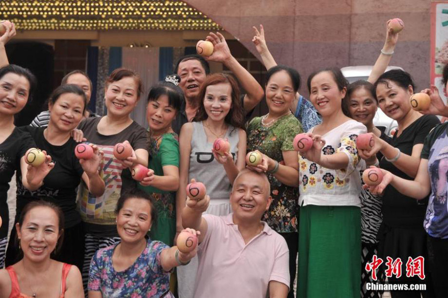Damas, holding apples marked with "6", pose for photo together. (CNS/Chen Chao)