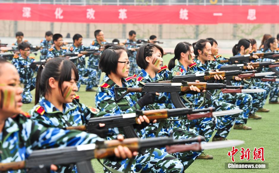 The ceremonial parade of the freshmen of Shandong University is held in Jinan, east China's Shandong province on Sept. 27, 2014. Female students were trained to use guns and to beat "enemies" in the course of catch and grapple. (CNS/Zhang Yong)