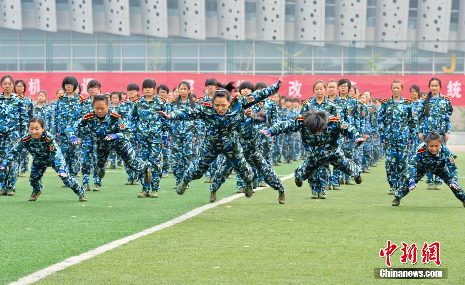 The ceremonial parade of the freshmen of Shandong University is held in Jinan, east China's Shandong province on Sept. 27, 2014. Female students were trained to use guns and to beat "enemies" in the course of catch and grapple. (CNS/Zhang Yong)