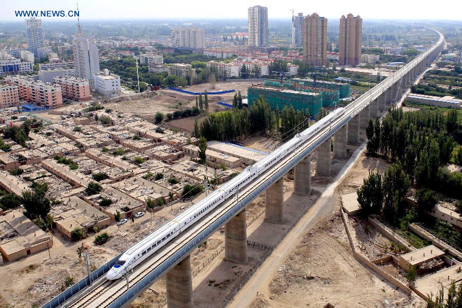 A bullet train runs across a bridge on its trial trip in Hami, northwest China's Xinjiang Uygur Autonomous Region, Sept. 14, 2014. The 1,776-km Lanxin Railway, which links Lanzhou City in northwestern Gansu Province and Urumqi City in Xinjiang Uygur Autonomous Region, will be Xinjiang's first high-speed railway when it begins operation by the end of this year. The Xinjiang section of the railway will be firstly put into service in October. (Xinhua/Cai Zengle)