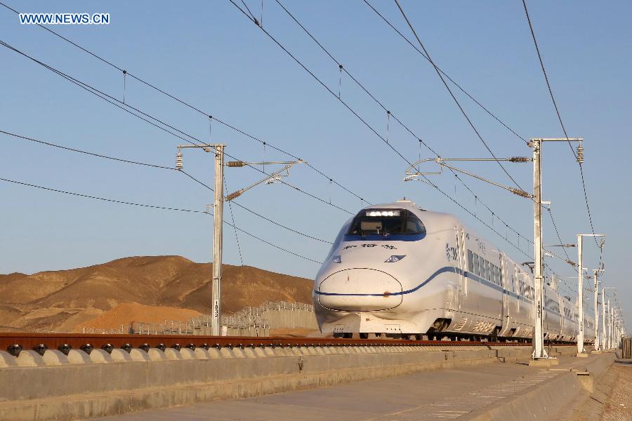 A bullet train runs across the Gobi Desert on its trial trip in Hami, northwest China's Xinjiang Uygur Autonomous Region, Sept. 15, 2014. The 1,776-km Lanxin Railway, which links Lanzhou City in northwestern Gansu Province and Urumqi City in Xinjiang Uygur Autonomous Region, will be Xinjiang's first high-speed railway when it begins operation by the end of this year. The Xinjiang section of the railway will be firstly put into service in October. (Xinhua/Cai Zengle)