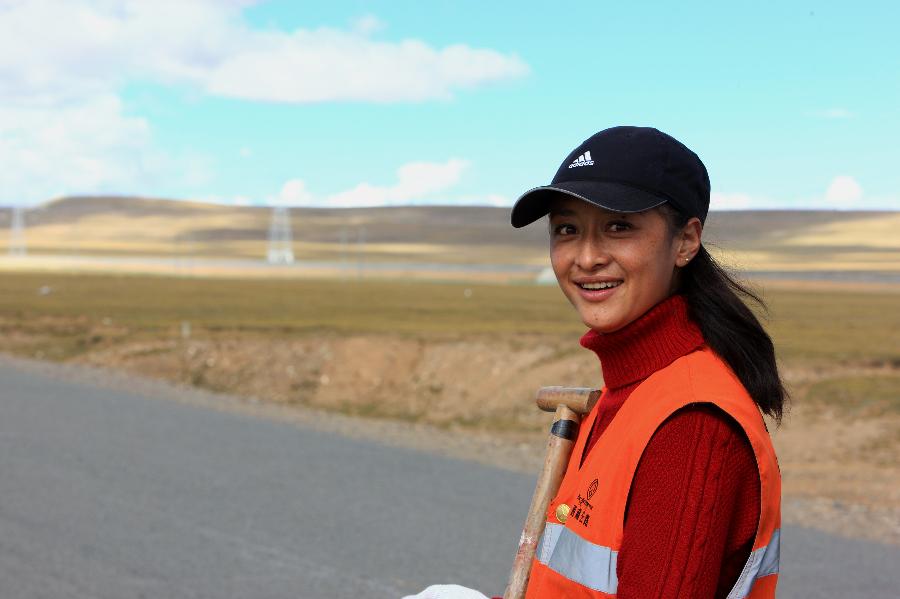 Photo taken on Sept. 20, 2014 shows Dawa Zhoima, a highway maintenance worker, working in Nagqu county, southwest China's Tibet Autonomous Region. Dawa Zhoima, 26, works on the Tanggula Range for daily maintenance of the Qinghai-Tibet highway. The year of 2014 marks the 60th anniversary of the opening of the Qinghai-Tibet highway. The highway, linking Xining, capital city of Qinghai province, and Lhasa, capital of the Tibet Autonomous Region, is a lifeline for Qinghai-Tibet Plateau. It boosts economic growth of regions along the road and makes lots of people's dreams come true. (Xinhua/Guo Qiuda)