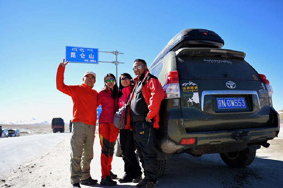Photo taken on Sept. 19, 2014 shows Li Xiaoming (1st L) and his friends posing for photos at the Kunlun Pass of the Qinghai-Tibet highway, northwest China's Qinghai Province. Li, a businessman from Beijing, visited Tibet in 2012 and came back many times since then. He wished to drive along the 318 national way from start to end next year. The year of 2014 marks the 60th anniversary of the opening of the Qinghai-Tibet highway. The highway, linking Xining, capital city of Qinghai province, and Lhasa, capital of the Tibet Autonomous Region, is a lifeline for Qinghai-Tibet Plateau. It boosts economic growth of regions along the road and makes lots of people's dreams come true. (Xinhua/Liu Dongjun)