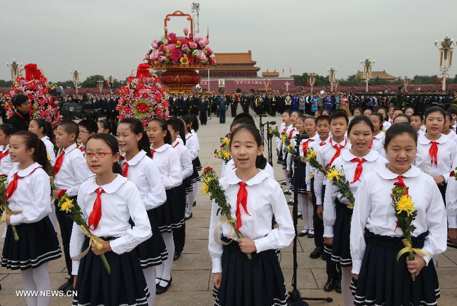 Young students sing a patriotic chorus song at the Monument to the People's Heroes in Tian'anmen Square, downtown Beijing, capital of China, Sept. 30, 2014, on the occasion of the first Martyrs' Day. China has rallied to honor and remember deceased national heroes on the first Martyrs' Day. (Xinhua/Pang Xinglei)