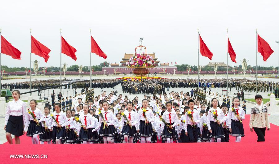 Young students present flowers to the deceased national heroes at the Monument to the People's Heroes in Tian'anmen Square, downtown Beijing, capital of China, Sept. 30, 2014, on the occasion of the first Martyrs' Day. (Xinhua/Huang Jingwen)