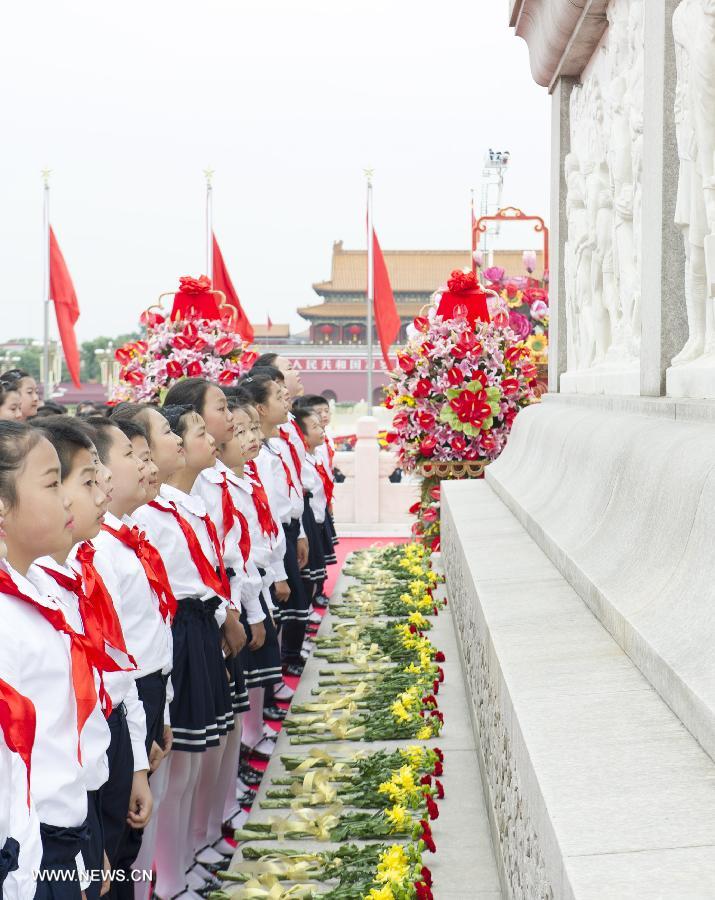 Young students present flowers to the deceased national heroes at the Monument to the People's Heroes in Tian'anmen Square, downtown Beijing, capital of China, Sept. 30, 2014, on the occasion of the first Martyrs' Day. (Xinhua/Huang Jingwen)