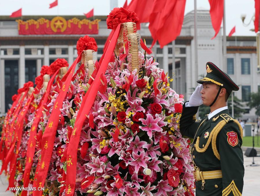 A soldier salutes beside flower baskets presented to the deceased national heroes at the Monument to the People's Heroes in Tian'anmen Square, downtown Beijing, capital of China, Sept. 30, 2014, on the occasion of the first Martyrs' Day. (Xinhua/Pang Xinglei)