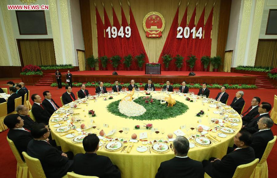 | Chinese leaders Xi Jinping, Li Keqiang, Zhang Dejiang, Yu Zhengsheng, Liu Yunshan, Wang Qishan and Zhang Gaoli attend the reception held by the State Council to celebrate the 65th anniversary of the founding of the People's Republic of China, in Beijing, China, Sept. 30, 2014. (Xinhua/Pang Xinglei) |