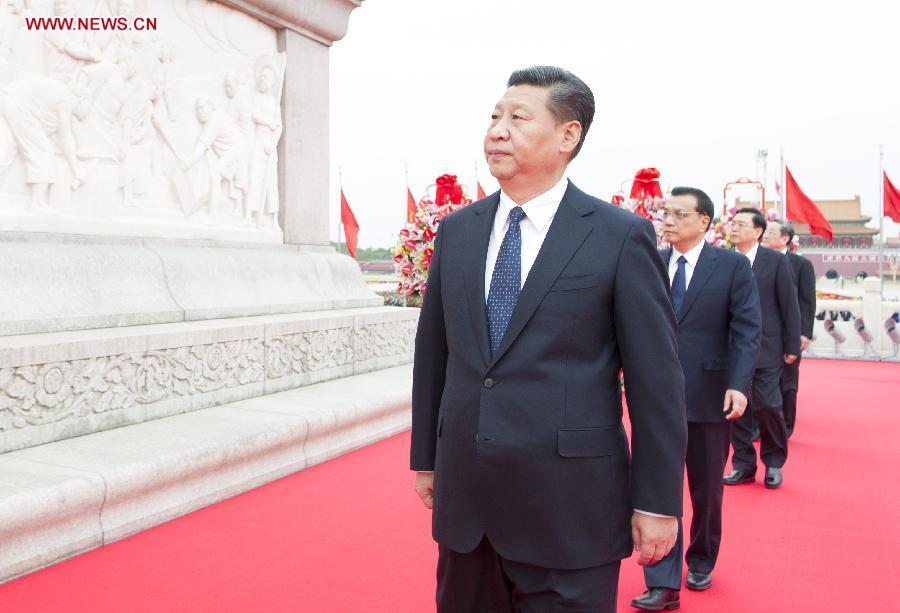 Chinese President Xi Jinping and other Chinese leaders pay respects to the Monument to the People's Heroes in Tian'anmen Square, Beijing, China, Sept. 30, 2014. Chinese leaders Xi Jinping, Li Keqiang, Zhang Dejiang, Yu Zhengsheng, Liu Yunshan, Wang Qishan and Zhang Gaoli offered flower baskets at the monument on the first Martyrs' Day on Tuesday. (Xinhua/Huang Jingwen)
