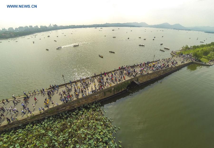 The West Lake scenic spot is crammed with tourists on the first day of the Chinese National Day holidays in Hangzhou, capital of east China's Zhejiang Province, Oct. 1, 2014. The "golden-week" National Day holidays are expected to bring a tourism peak across the country. (Xinhua/Xu Yu)