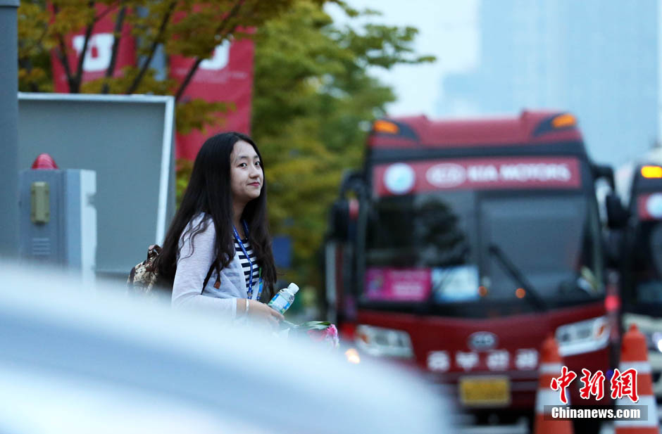 Zhou Qi waits for the bus to go home in Incheon, Sept. 28, 2014. (Chinanews.com/Tang Yanjun)